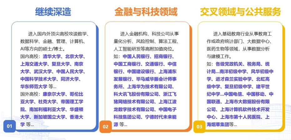 数学系学生在全校都有着“学霸”称号,各方面表现有目共睹,毕业生更是我们的骄傲,近四年来保持着100%就业率,每年出国、考研、直研比例不断提高,超过45%的同学出国深造、近30%的同学国内读研继续深造。很多同学进入了复旦大学、浙江大学、上海科技大学等国内知名院校深造,还有一批学生去了美国纽约大学、英国帝国理工大学、日本早稻田大学、美国波士顿大学等国外知名学院攻读硕士、博士。就业行业多在软件相关、银行、证券金融、公务员、学校等行业。